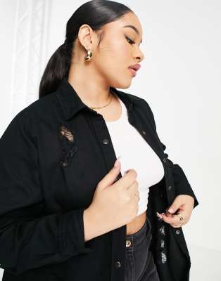 Black Ripped Denim Long Sleeve Shirt